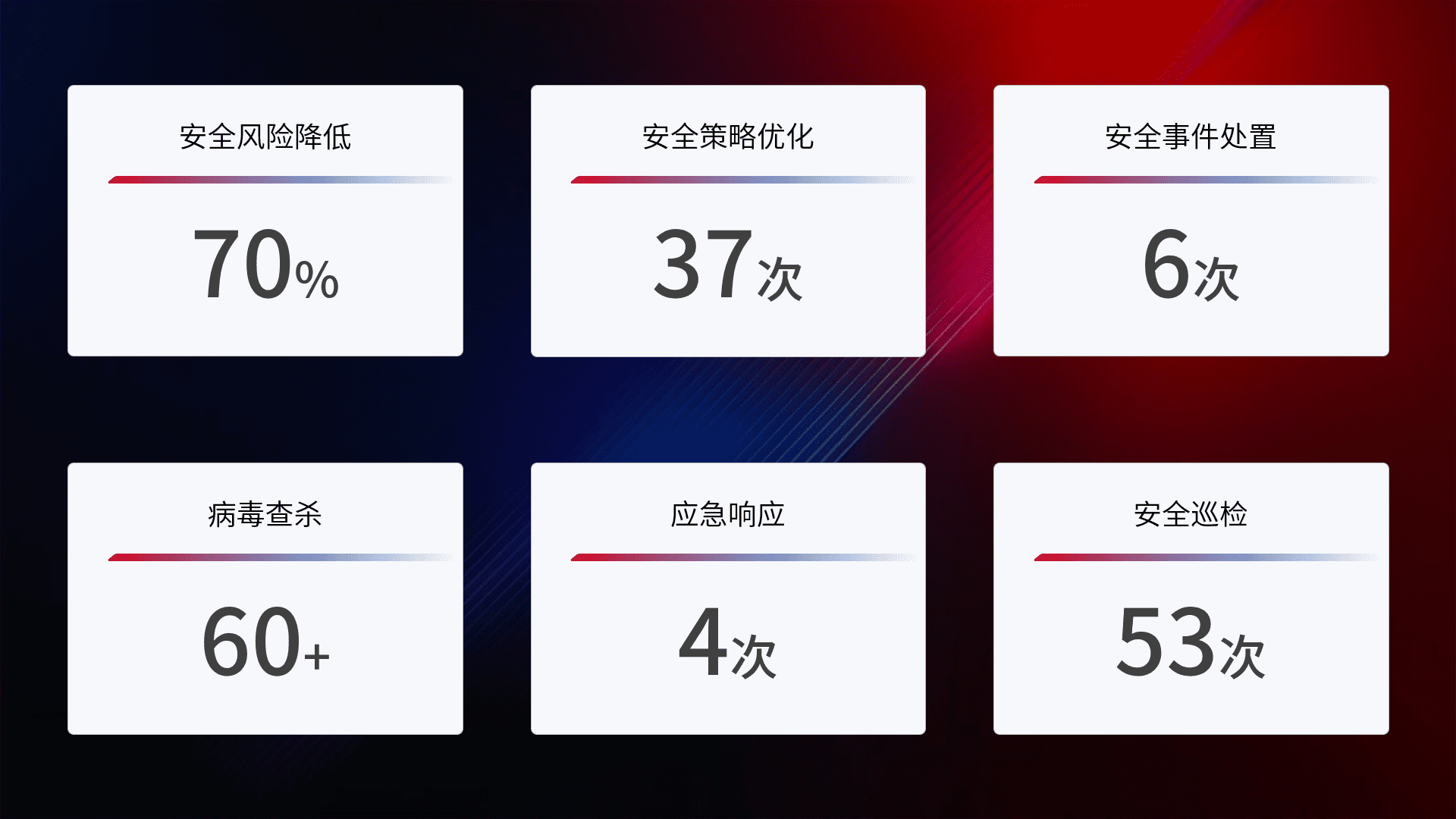 提供全面的安全事件报告体系,,包括处置报告、、、周报、、、、季度和年度总结,,,,结合持续监控,,帮助客户深入了解网络安全状况。。。。