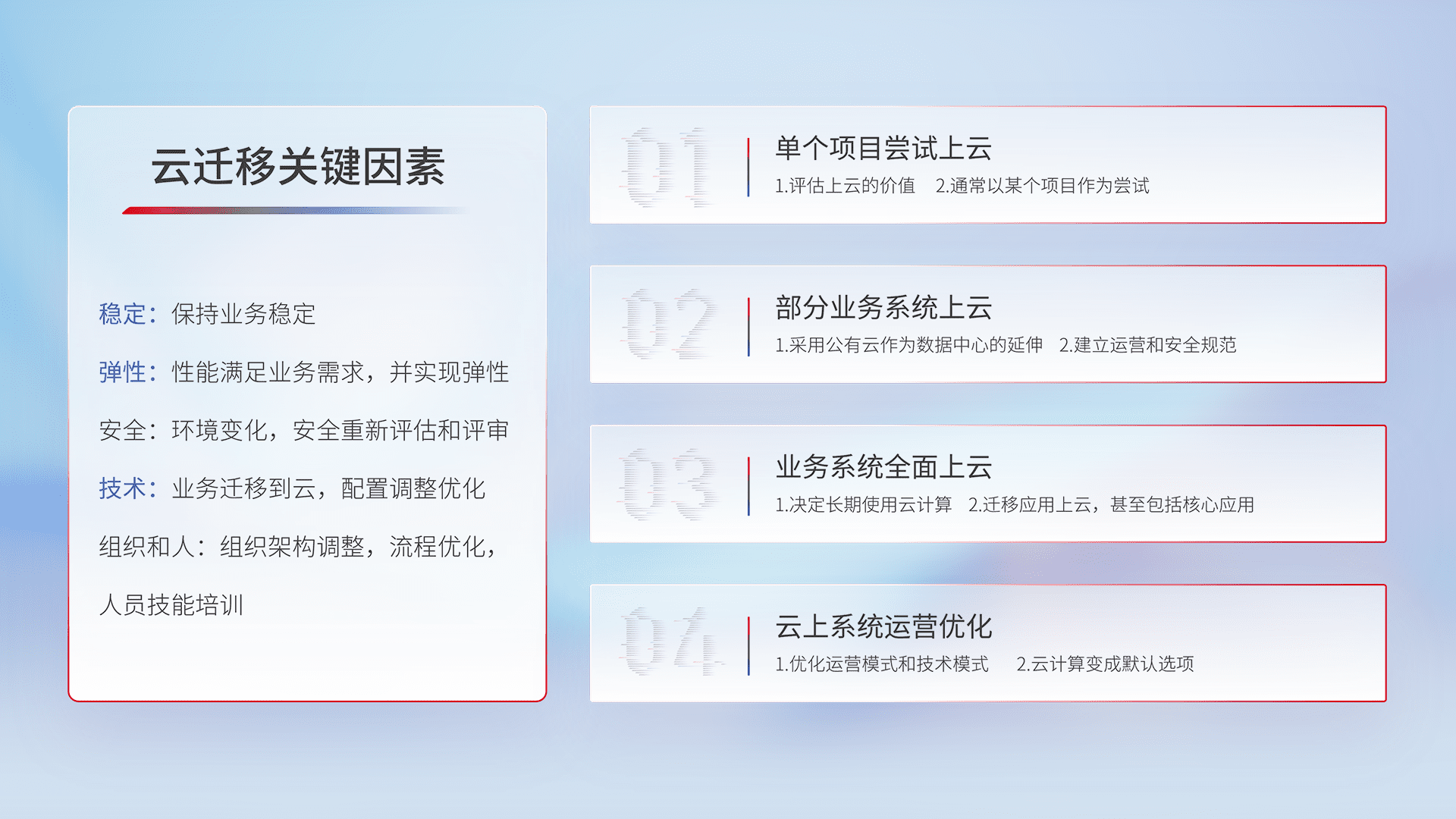 结合实际业务,,,从规划设计、、、云平台选型、、、、云原生改造、、、、数据迁移、、集成交付,,迁移全过程为客户识别最佳上云路径,,,做好风险识别管理,,设计网络架构、、、身份权限、、安全审计合规、、操作审计、、、、日志审计、、监控告警策略、、多站点容灾设计等,,,对云上基础设施进行整体规划,,,,提升IT治理水平,,以满足弹性、、高可用、、高性能的需求。。